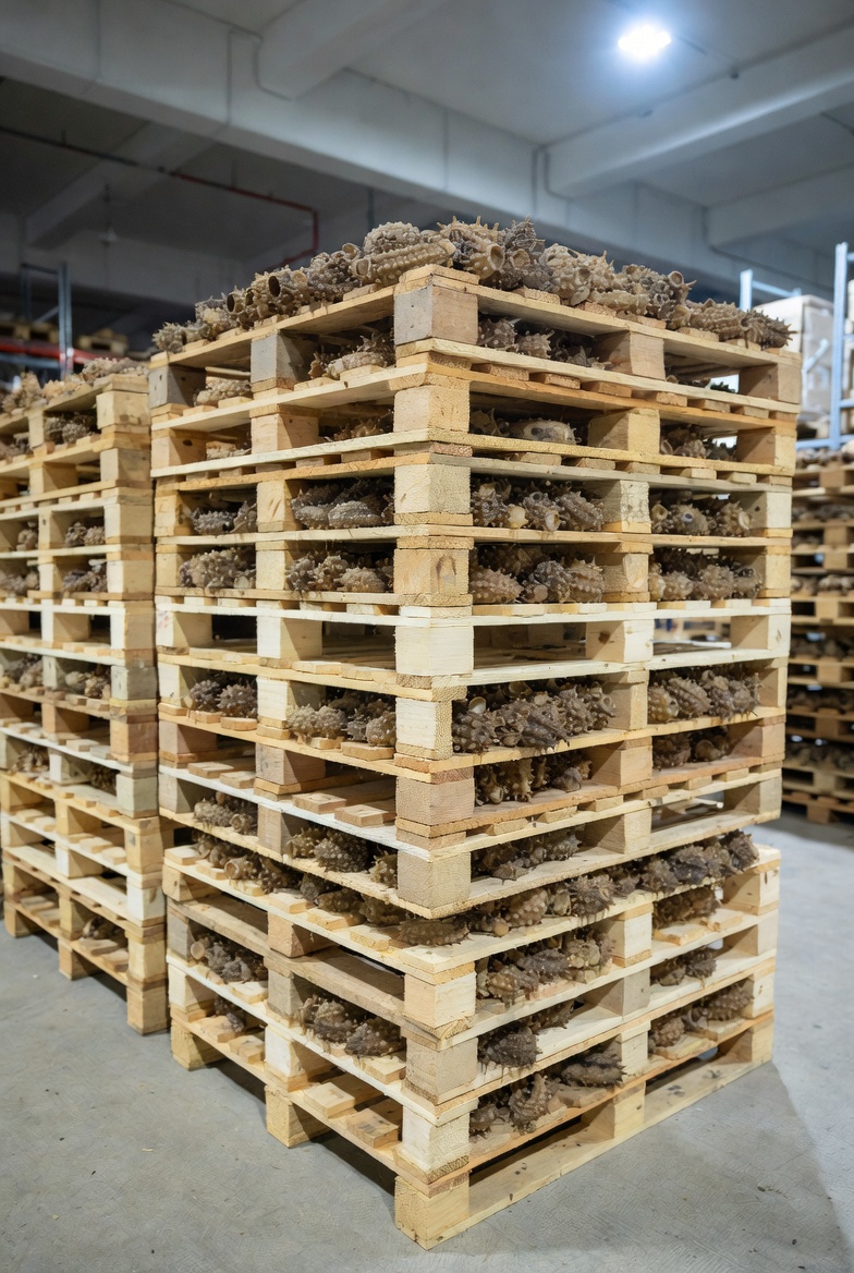 Premium dried sea cucumber, processed and ready for export. Each pallet contains approximately 500kg of product.
